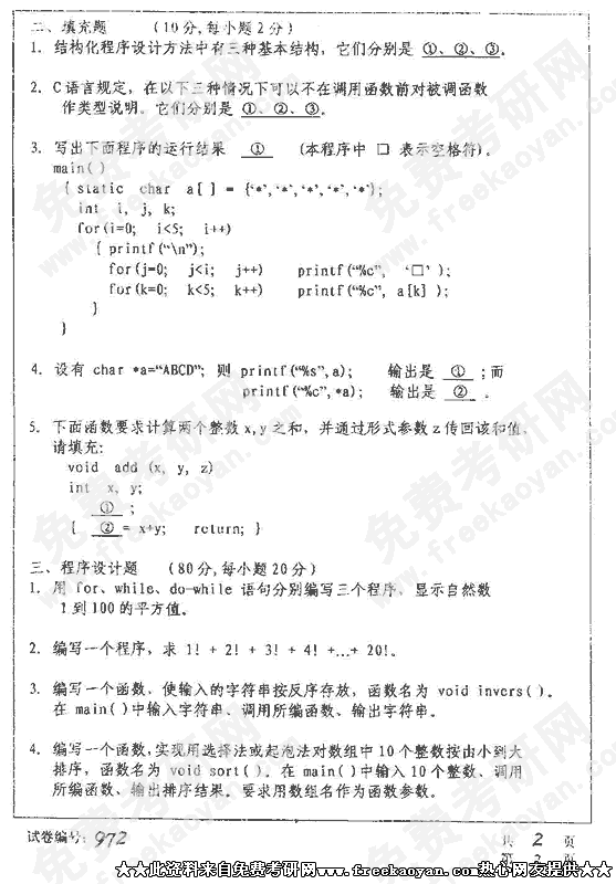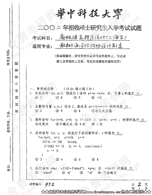 华中科技大学2002年半岛在线注册真题-高级语言程序设计(C语言)