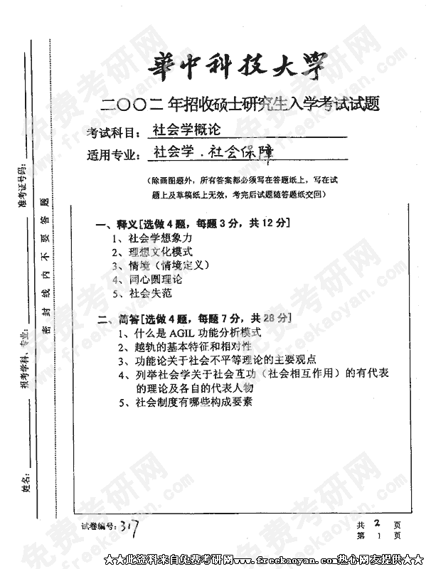 华中科技大学2002年半岛在线注册真题-社会学概论