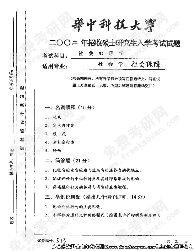 华中科技大学2002年半岛在线注册真题-社会心理学