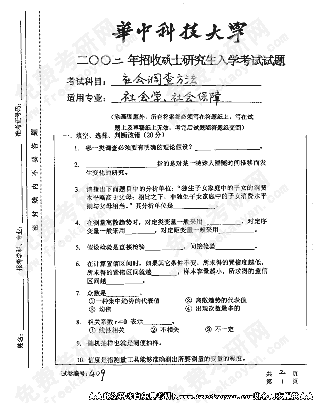 华中科技大学2002年半岛在线注册真题-社会调查方法