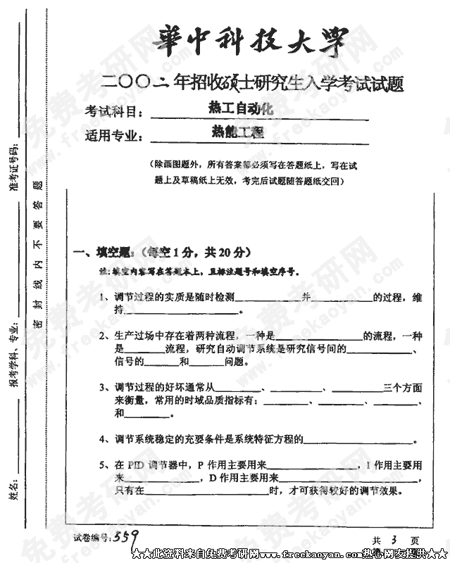 华中科技大学2002年半岛在线注册真题-热工自动化
