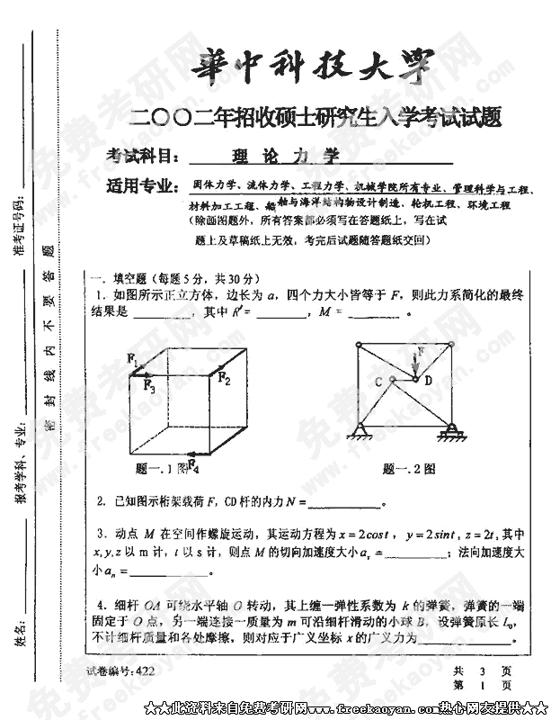 华中科技大学2002年半岛在线注册真题-力学与电磁学