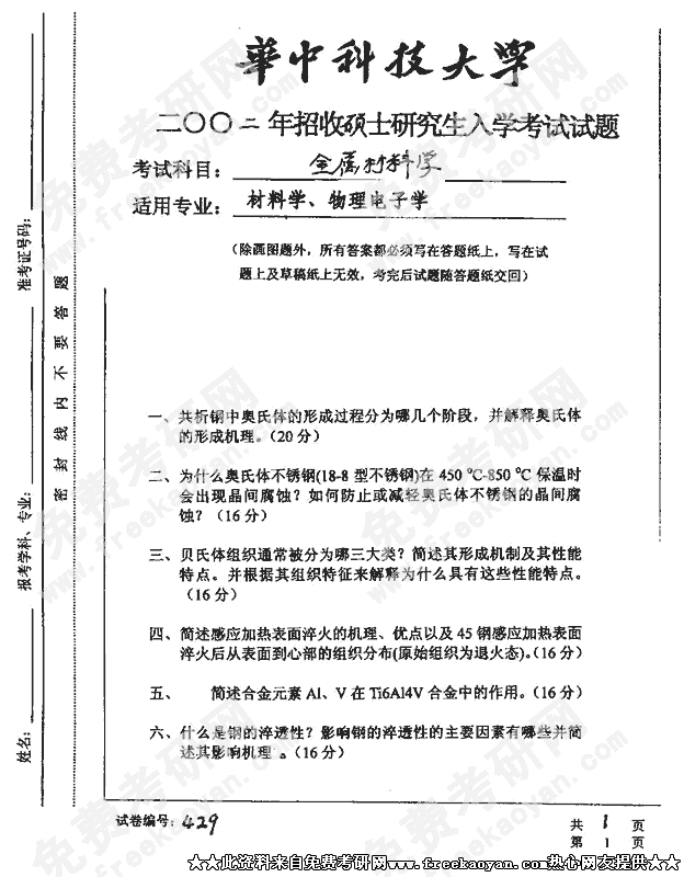 专业课半岛在线注册经验 本站小编 FreeKaoyan 2018-01-22华中科技大学2002年半岛在线注册真题-金属学与热处理