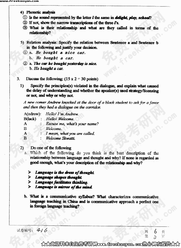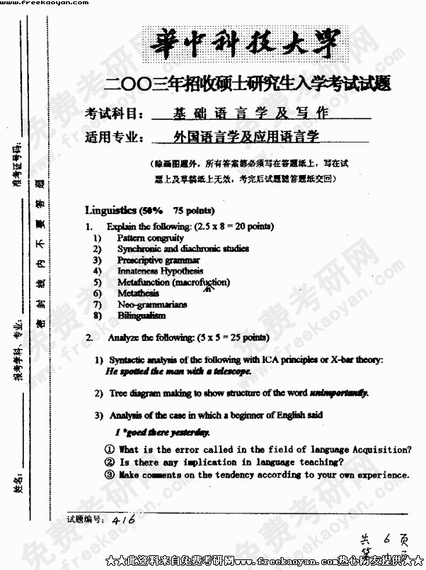华中科技大学2003年半岛在线注册真题-基础语言学及写作