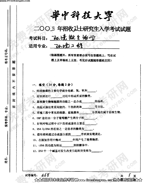 华中科技大学2003年半岛在线注册真题-环境微生物学