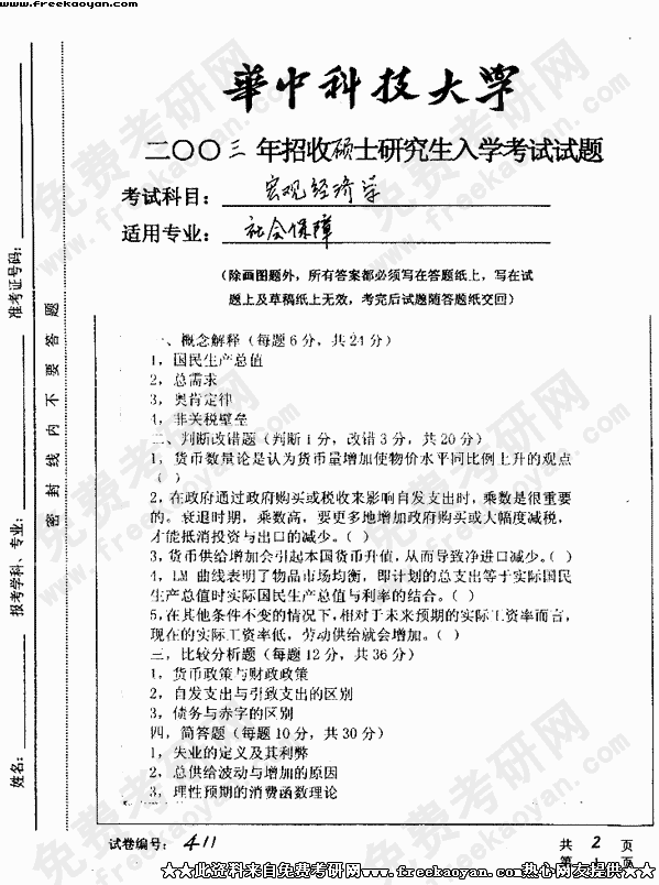 华中科技大学2003年半岛在线注册真题-宏观经济学