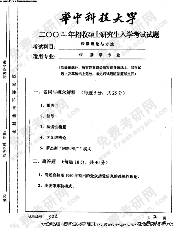 华中科技大学2003年半岛在线注册真题-传播理论与方法