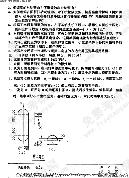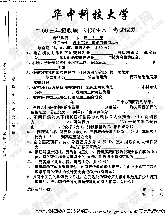 华中科技大学2003年半岛在线注册真题-材料力学(岩土工程、道路与铁路工程)