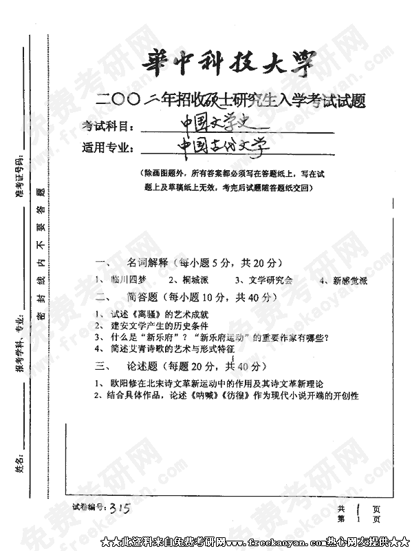 华中科技大学2002年半岛在线注册真题-中国文学史