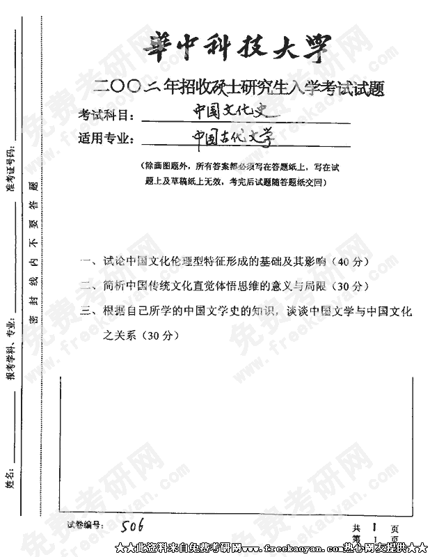 华中科技大学2002年半岛在线注册真题-中国文化史