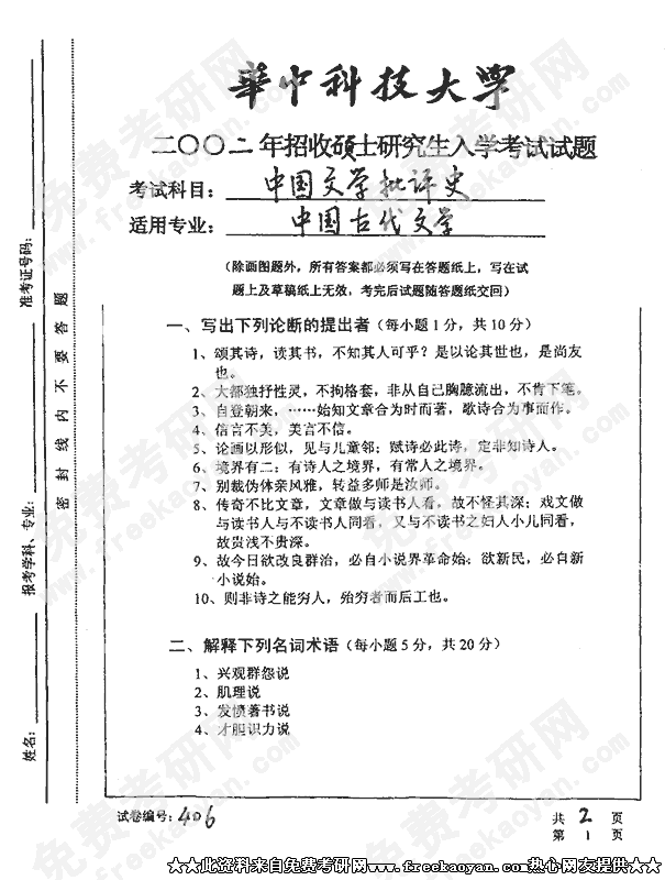 华中科技大学2002年半岛在线注册真题-中国史文学批评