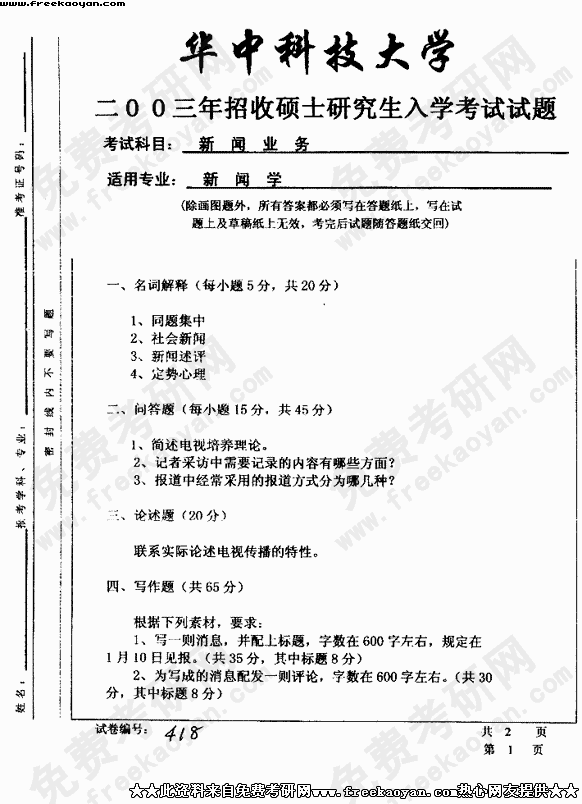 华中科技大学2003年半岛在线注册真题-新闻业务(新闻学)