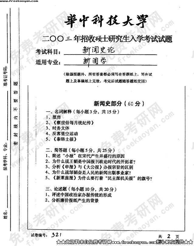 华中科技大学2003年半岛在线注册真题-新闻史论