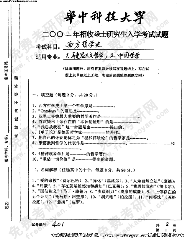 华中科技大学2003年半岛在线注册真题-西方哲学史