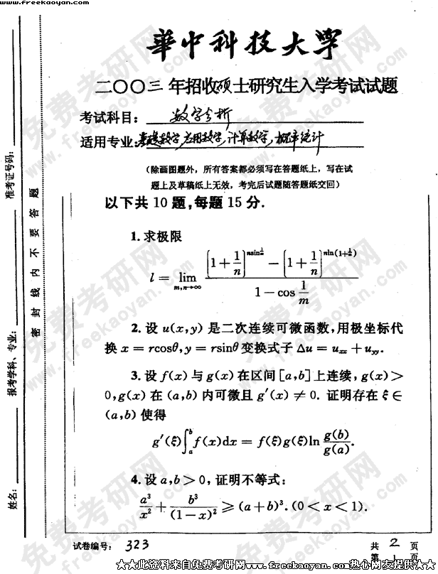 华中科技大学2003年半岛在线注册真题-无机与分析化学