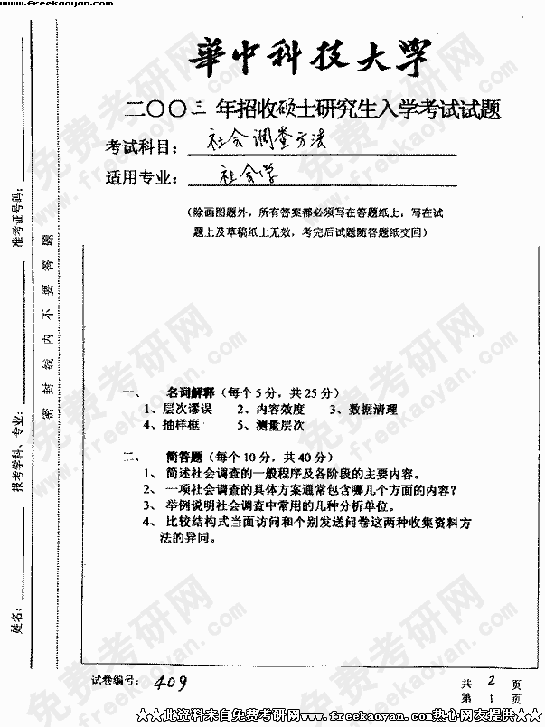 华中科技大学2003年半岛在线注册真题-社会调查方法