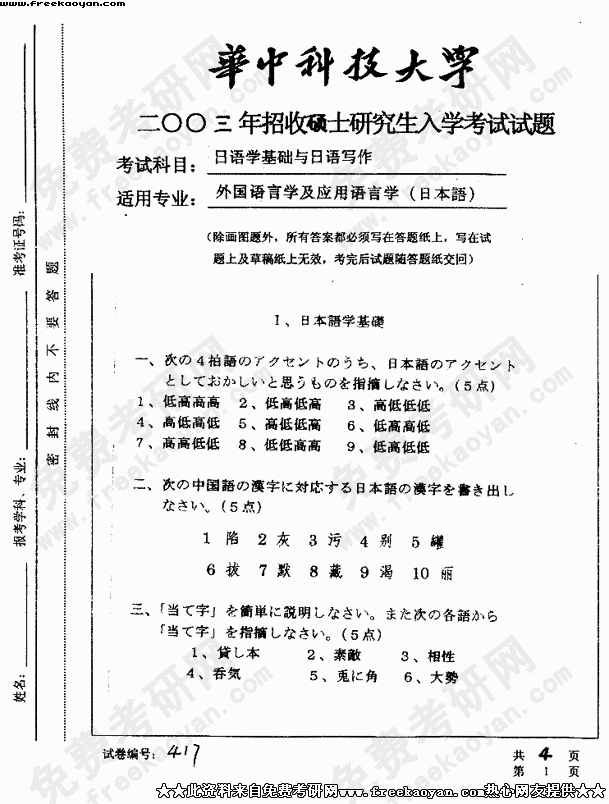 华中科技大学2003年半岛在线注册真题-日语学基础与日语写作