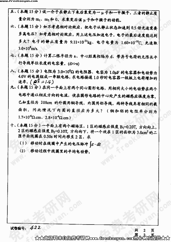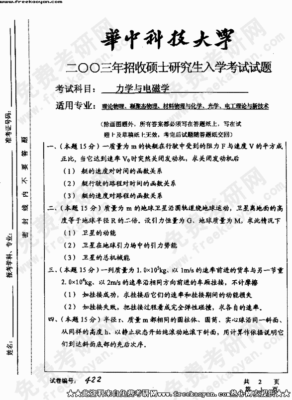 华中科技大学2003年半岛在线注册真题-力学与电磁学