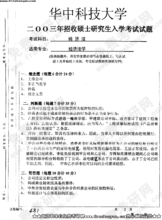 华中科技大学2003年半岛在线注册真题-力学与电磁学