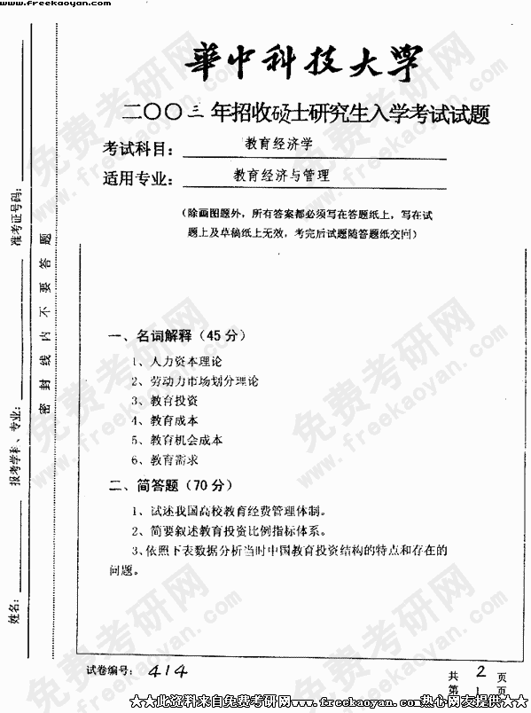 华中科技大学2003年半岛在线注册真题-教育经济学