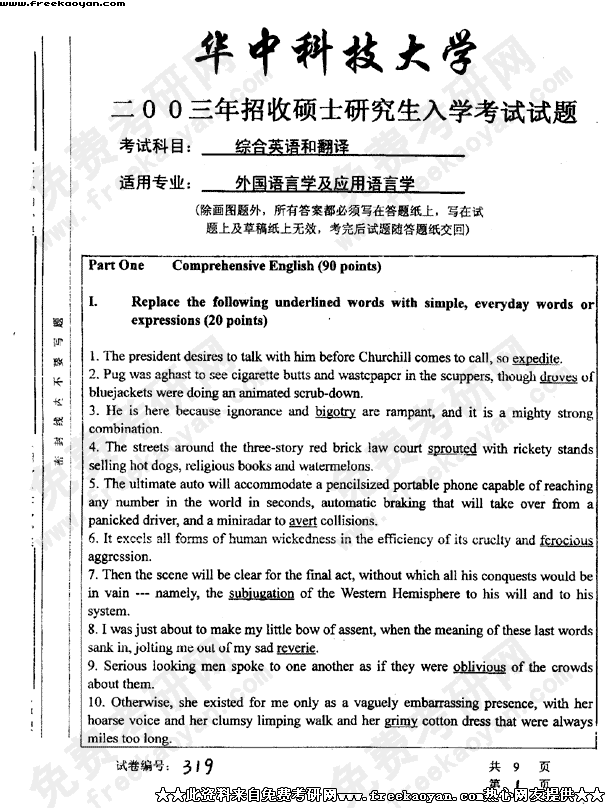 华中科技大学2003年半岛在线注册真题-综合英语和翻译