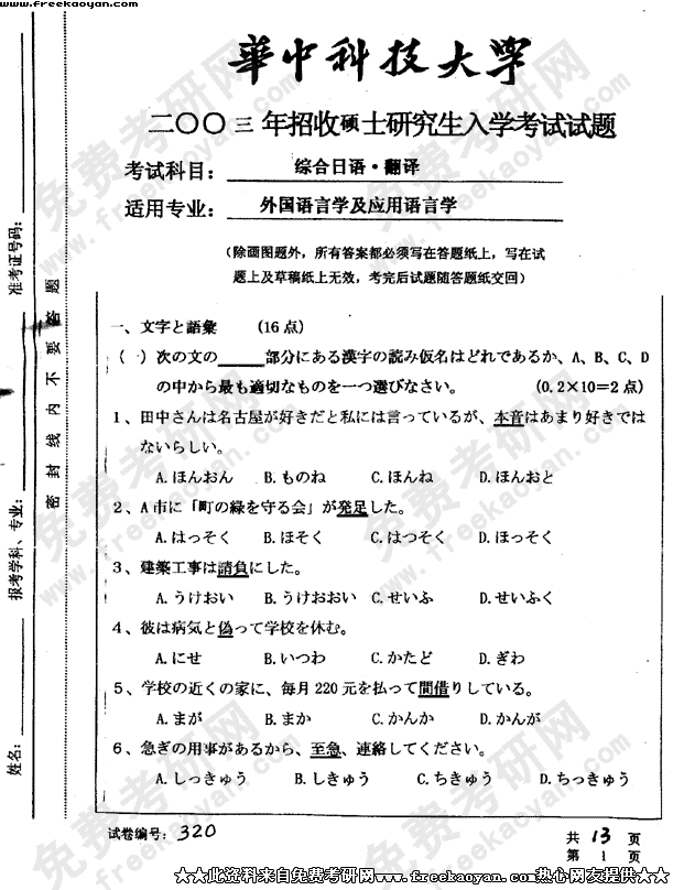 华中科技大学2003年半岛在线注册真题-综合日语.翻译