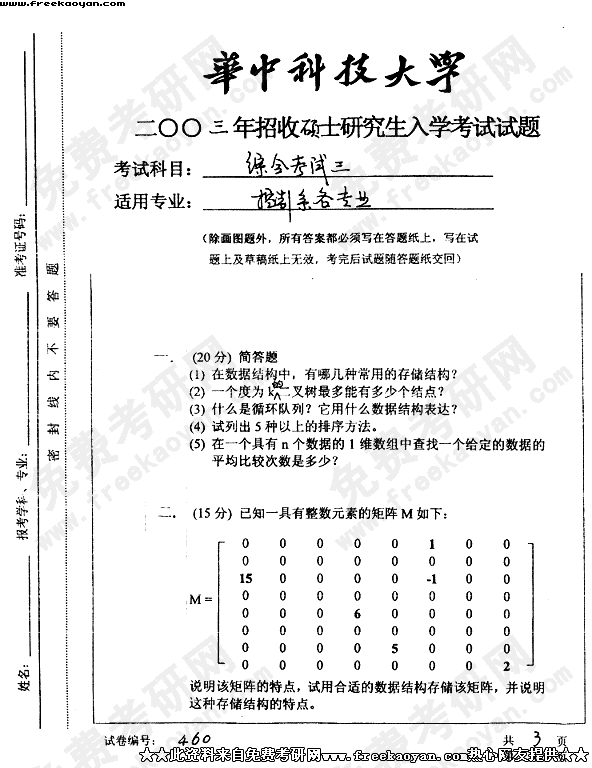 华中科技大学2003年半岛在线注册真题-综合考试三(控制系各专业)