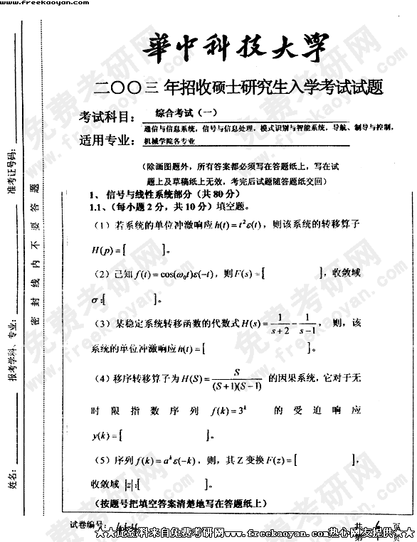 华中科技大学2003年半岛在线注册真题-通信,信号,机械综合考试(一)