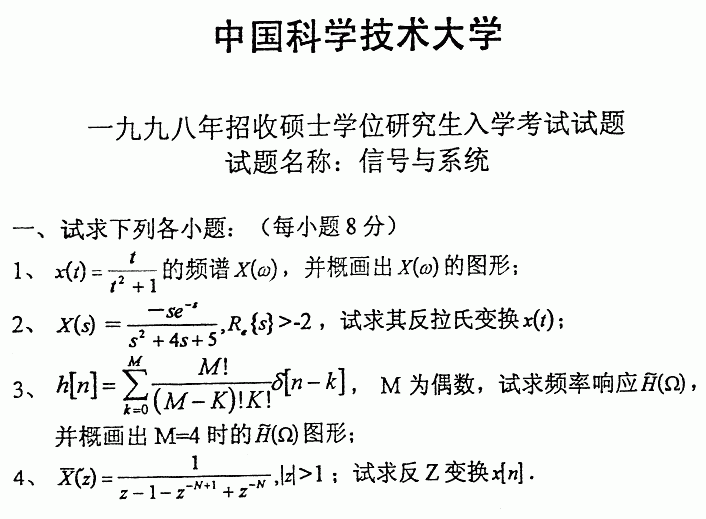 中国科学技术大学1998年半岛在线注册真题-信号与系统