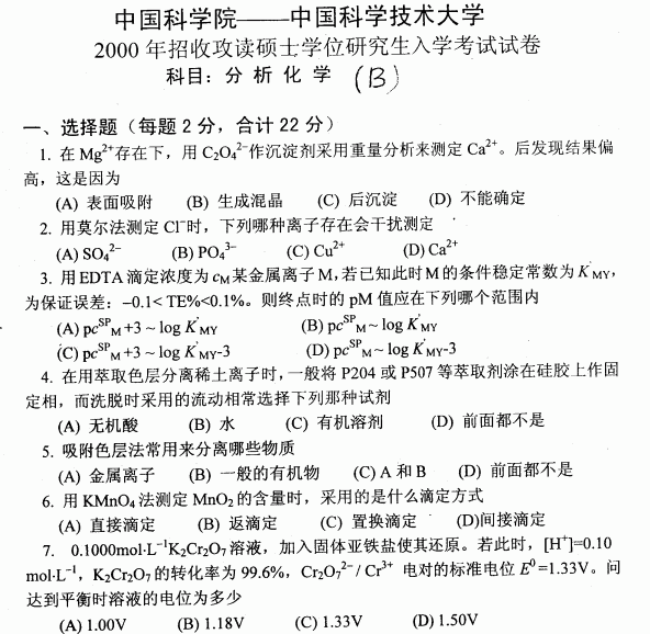 中国科学技术大学2000年半岛在线注册真题-分析化学B
