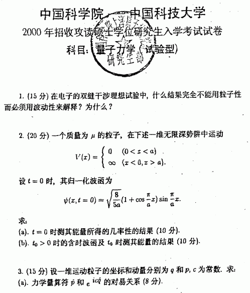 中国科学技术大学2000年半岛在线注册真题-量子力学(实验型)
