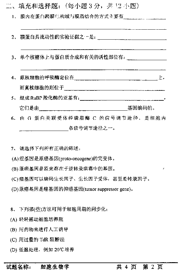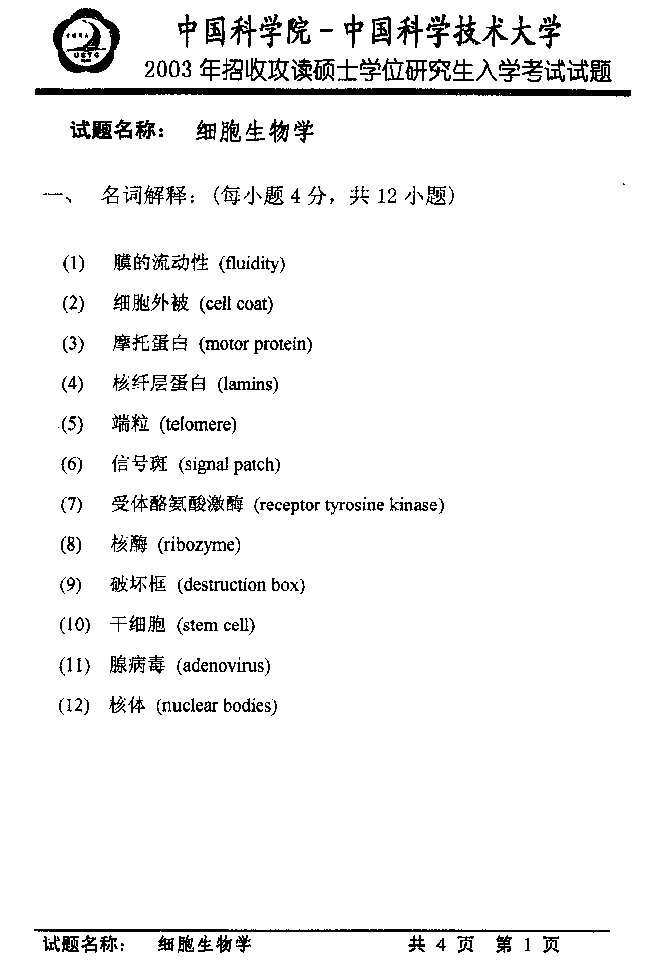 中国科学技术大学2003年半岛在线注册真题-细胞生物学