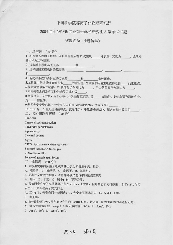 中国科学技术大学2004年半岛在线注册真题-遗传学