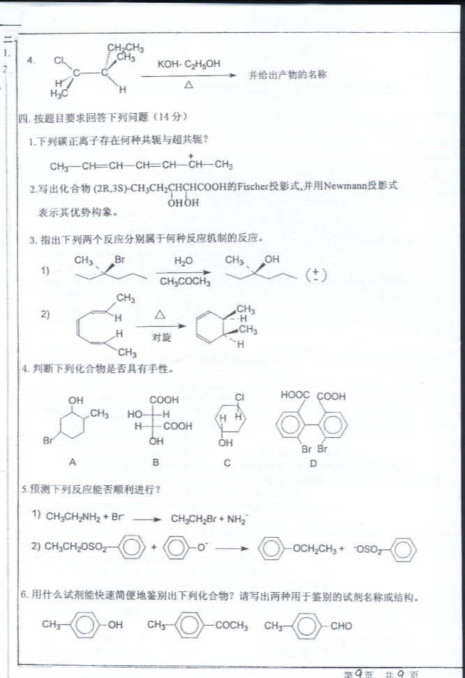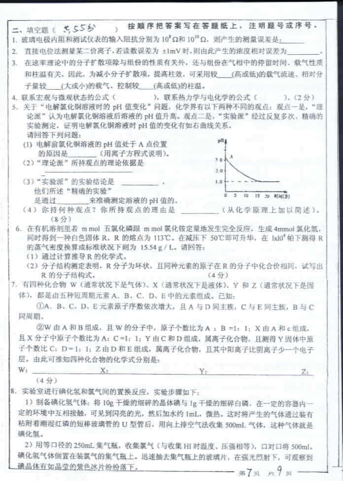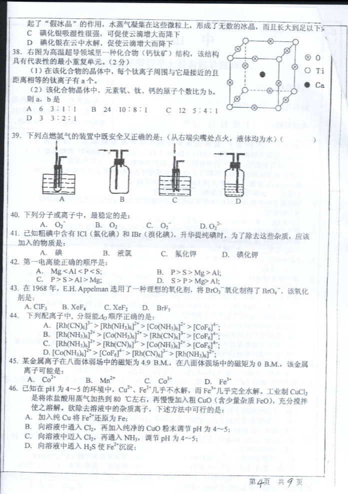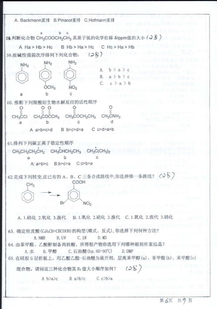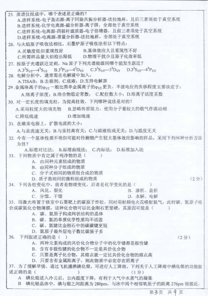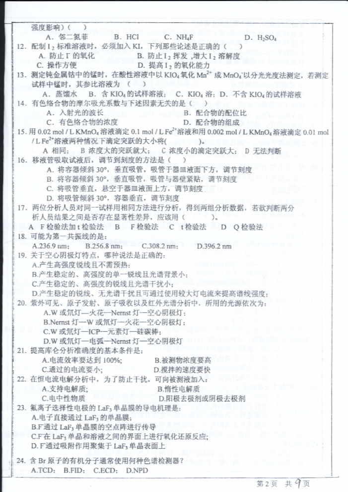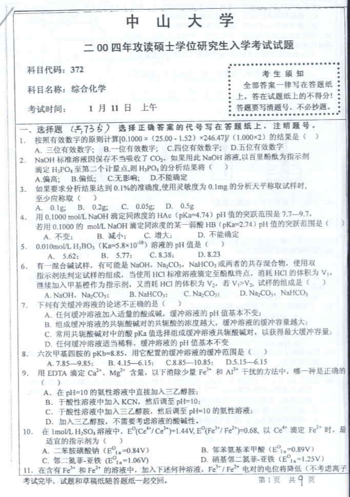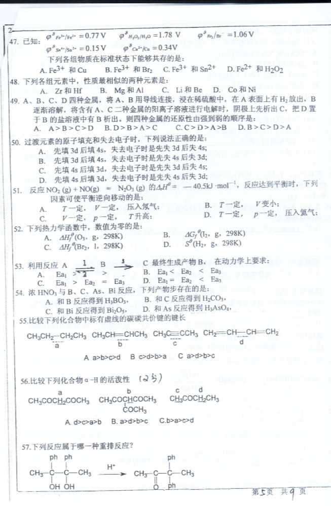 考试科目:无机化学专业:无机化学、分析化学、有机化学、物理化学、环境化学研究方向:以上专业所有方向一、选择题(共15分)1、 在常温下,Cl2 、、Br2、I2与NaOH作用正确的是--------( )(a) Br2生成NaBr、NaBrO(b) Cl2生成NaCl、NaClO(c) I2生成Na ...