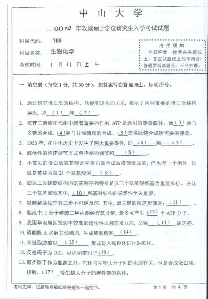 中山大学2004年半岛在线注册真题-生物化学