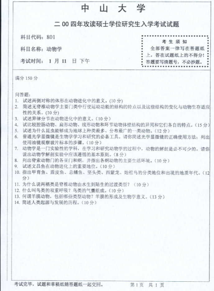 中山大学2004年半岛在线注册真题-动物学