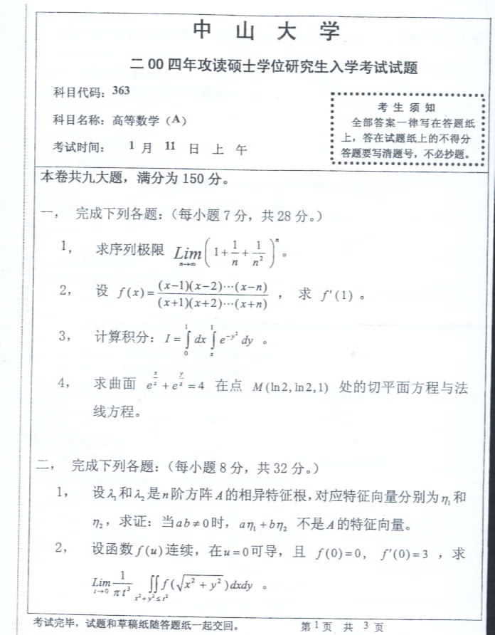 专业课半岛在线注册经验 本站小编 FreeKaoyan 2018-01-22中山大学2004年半岛在线注册真题-数学四