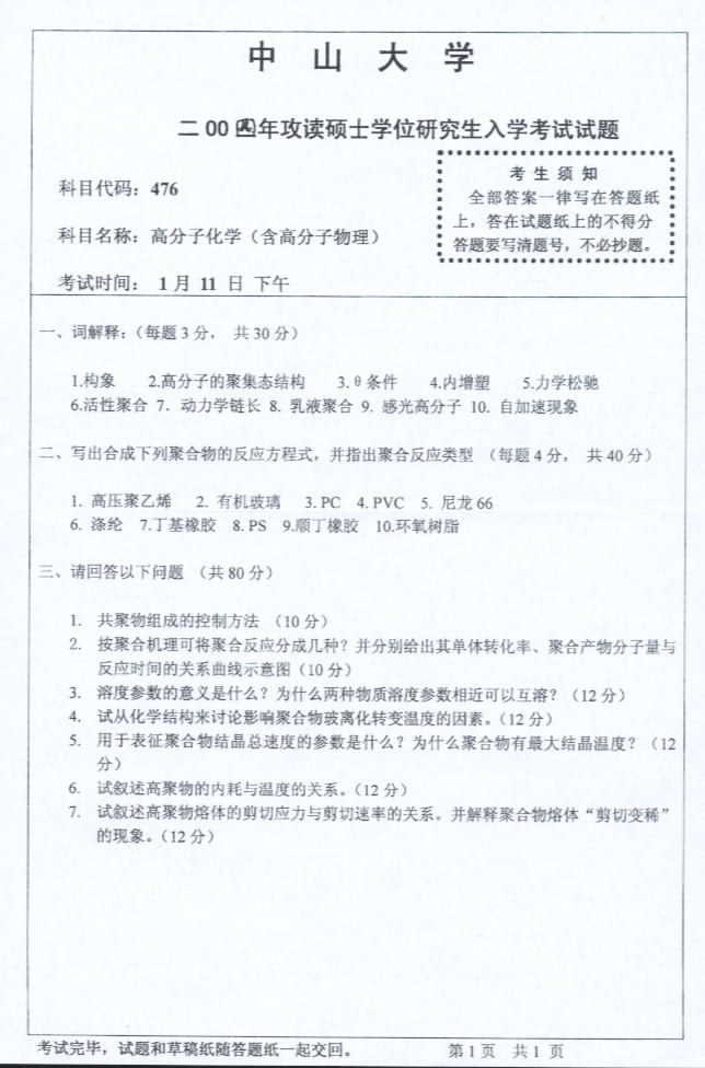 中山大学2004年半岛在线注册真题-高分子化学含高分子物理