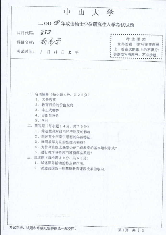 中山大学2004年半岛在线注册真题-教育学