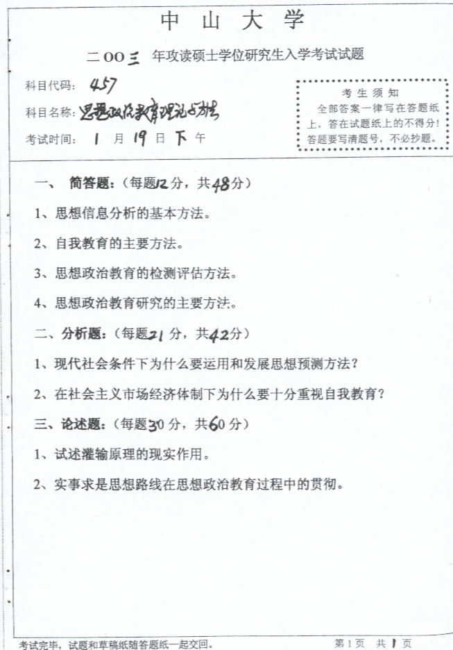 中山大学2003年半岛在线注册真题-思想政治理论与方法