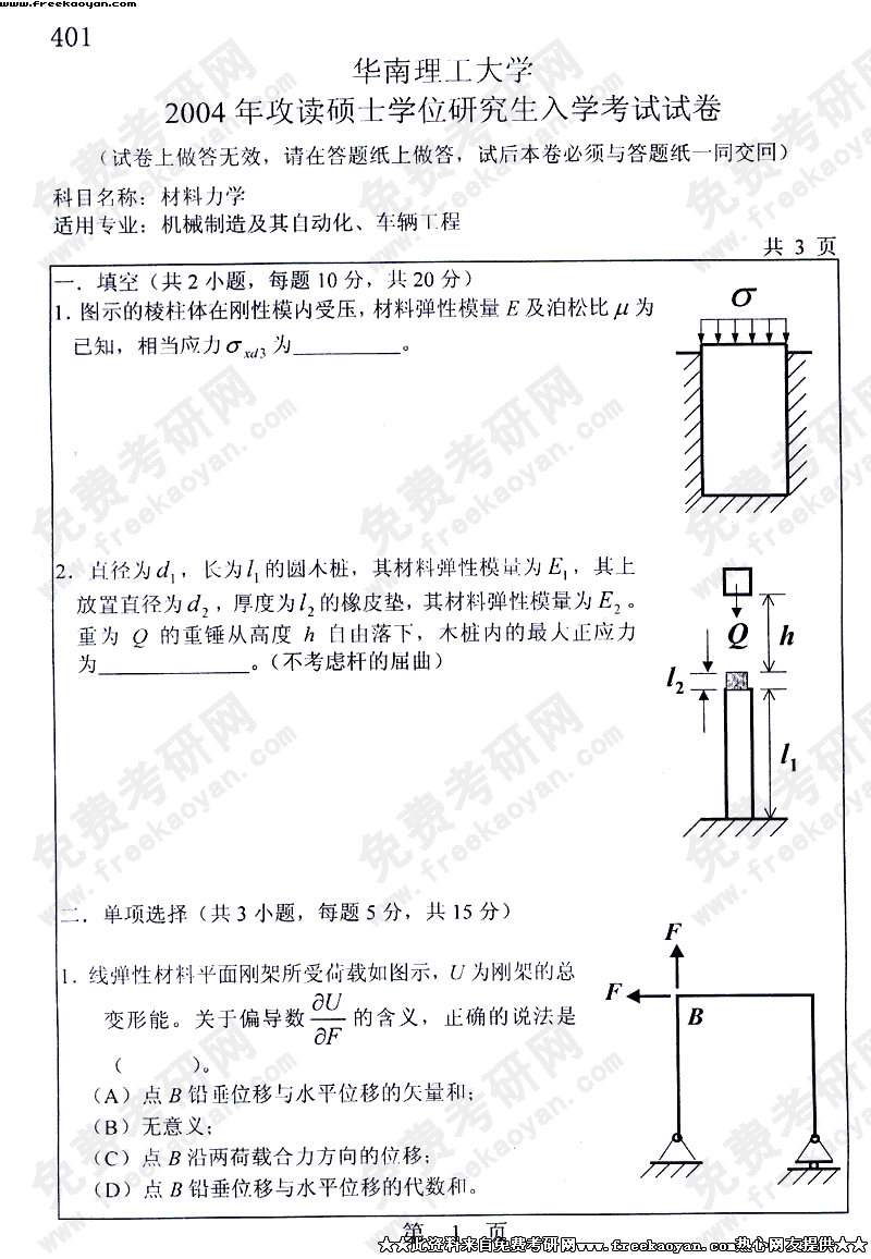 华南理工大学2004年半岛在线注册真题-材料力学(机)