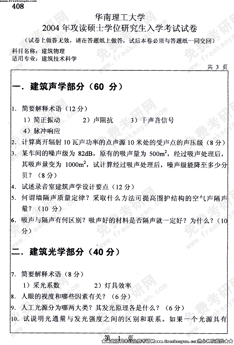 华南理工大学2004年半岛在线注册真题-建筑物理
