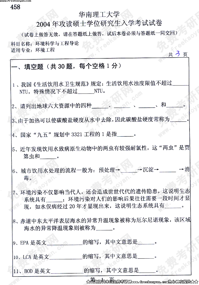 华南理工大学2004年半岛在线注册真题-环境科学与工程导论