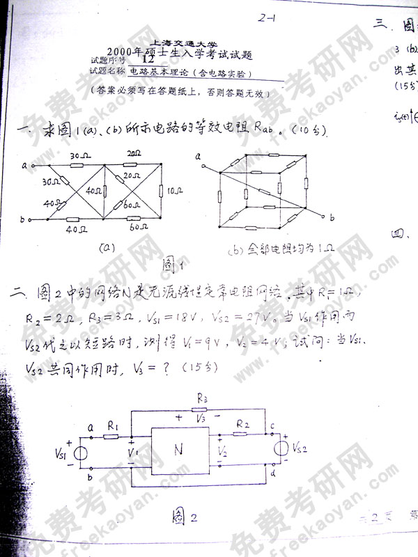 上海交通大学2000年半岛在线注册真题-电路基本理论