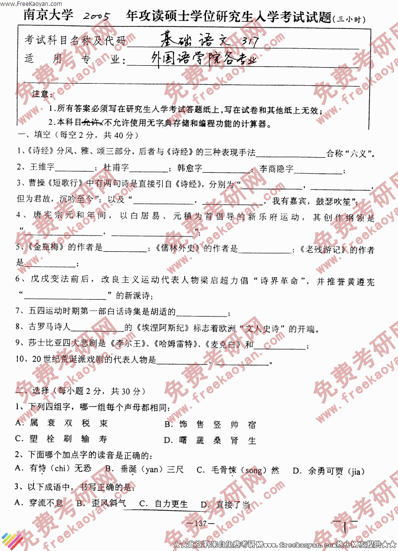 南京大学2005年半岛在线注册真题-基础语文
