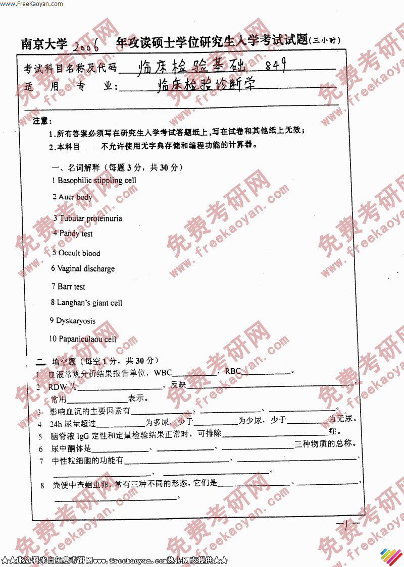 南京大学2006年半岛在线注册真题-临床检验基础(临床检验诊断学)