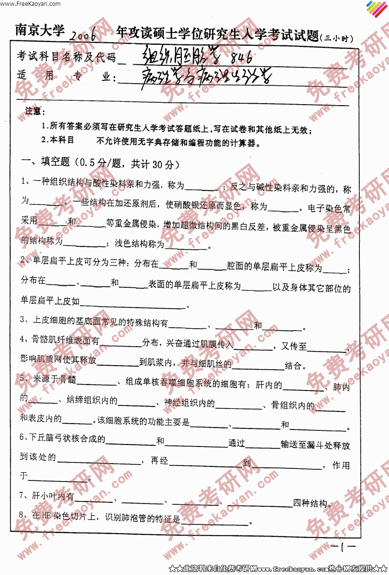 南京大学2006年半岛在线注册真题-组织胚胎学(病理学与生理学)