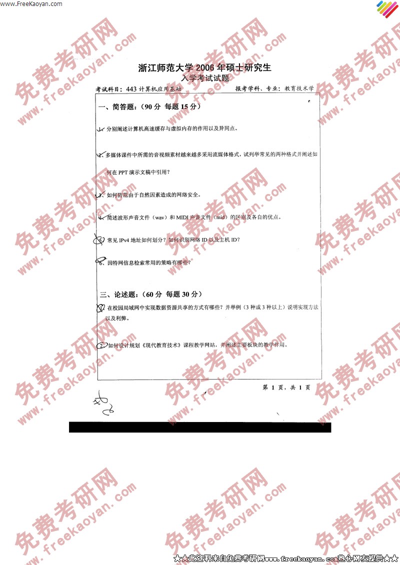 浙江师范大学2006年半岛在线注册真题-计算机应用基础