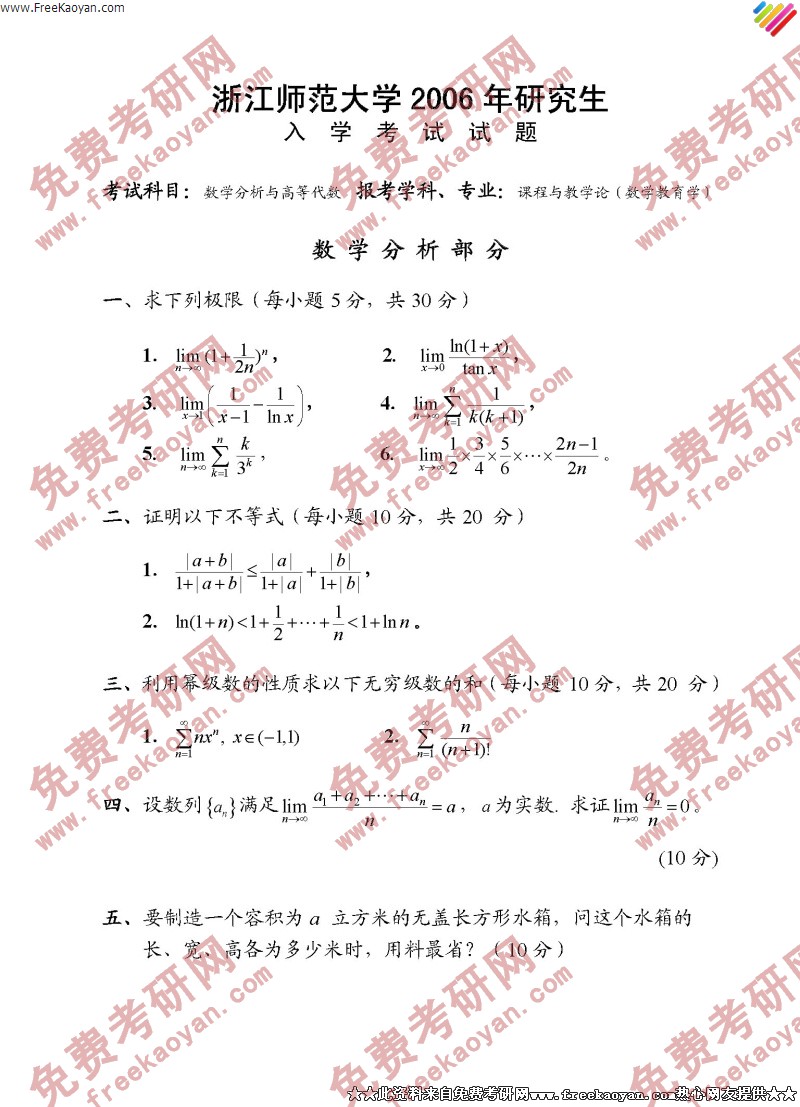 专业课半岛在线注册经验 本站小编 FreeKaoyan 2018-01-22浙江师范大学2006年半岛在线注册真题-数学分析