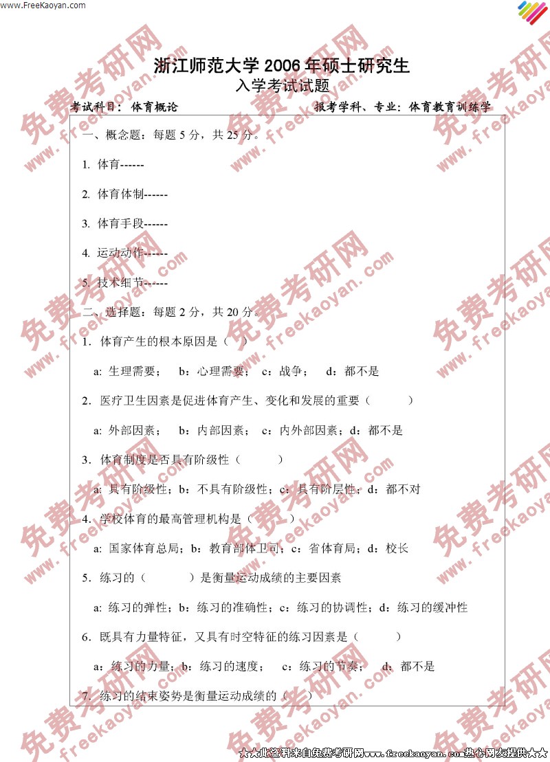 浙江师范大学2006年半岛在线注册真题-体育概论